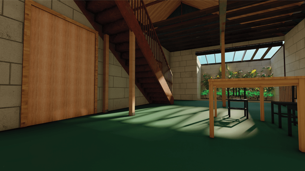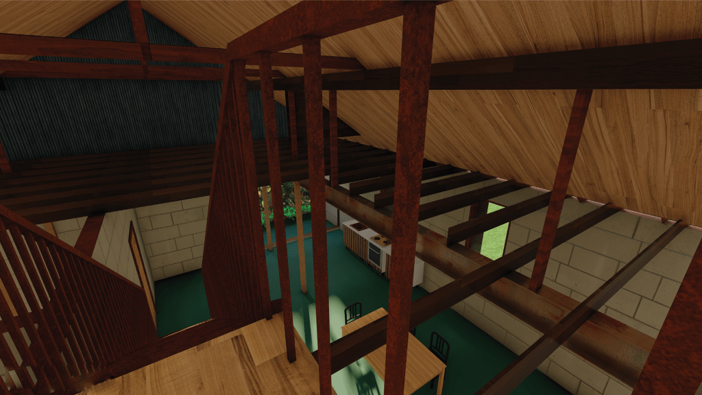 A glass atrium like space aims to bring some of the outside indoors, the rustic wood is retained and highlighted, and raw steel tie in the purposeful and past industrial nature of the space. A simple small bathroom that is all abilities accessible to Australian standards uses corrugated iron to tie in with the patina of the roof. The inside of the roof will be clad, ensuring the insulation has another layer to prevent unwanted solar gain and heat loss. The stairway and railing would be fabricated and have been placed to take up the least amount of room possible. The old metal on site used for window shades on the east side as there is less overhang, and for the shading of the circular feature window in the loft. An industrial kitchen gives a robust purposefulness.