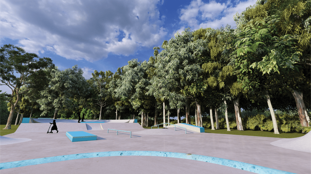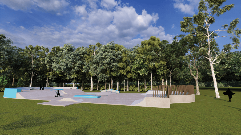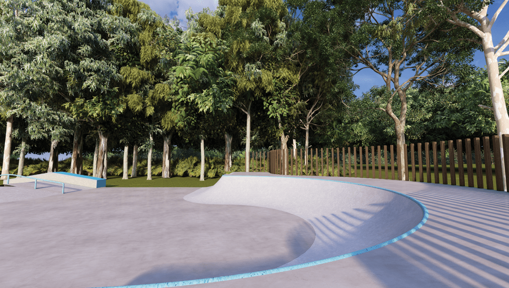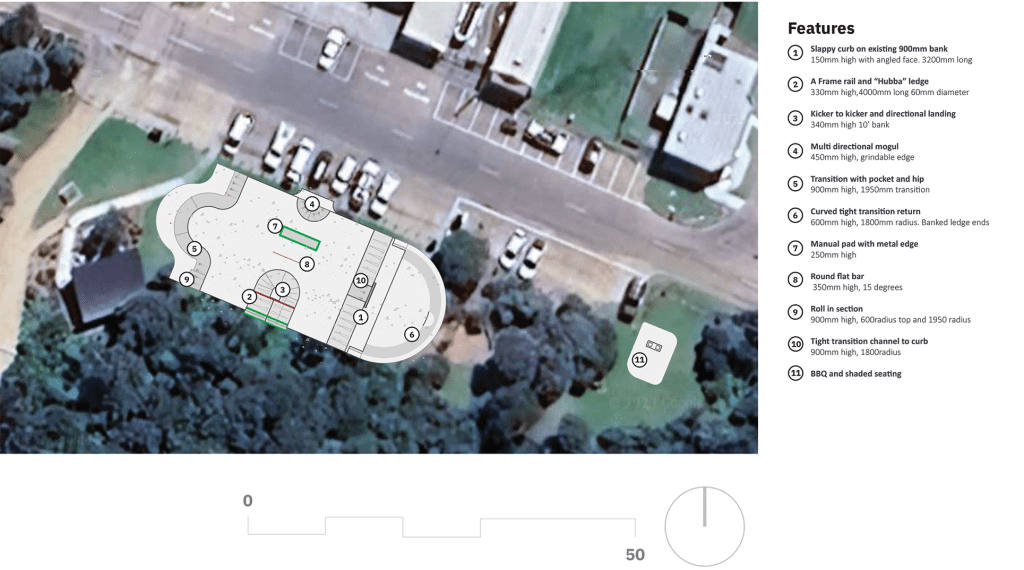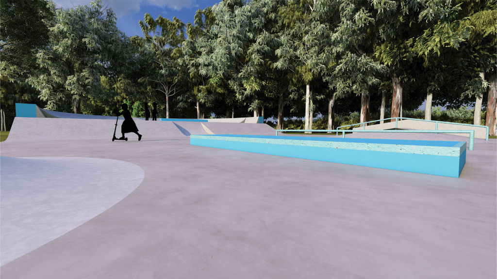 The intent for the obstacles is to flow and lead to each other, to be both a linear and circular skatepark. This is in line with the surf culture of the site. The park is suitable for all users from beginners and people having a first try, to experienced and veteran users. It is a beginner to intermediate park in nature with the highest obstacles being 900mm high. The rail and manual pad are suitable for all skill levels and are essential obstacles for every park. Bank to bank and A frame “hubba” and rail are perfect for a smaller park with a single level. Bank to bank, curved hip and multi directional mogul feature can be used to access the hips at speed. These features are suitable as a beginner obstacle for less experienced users.